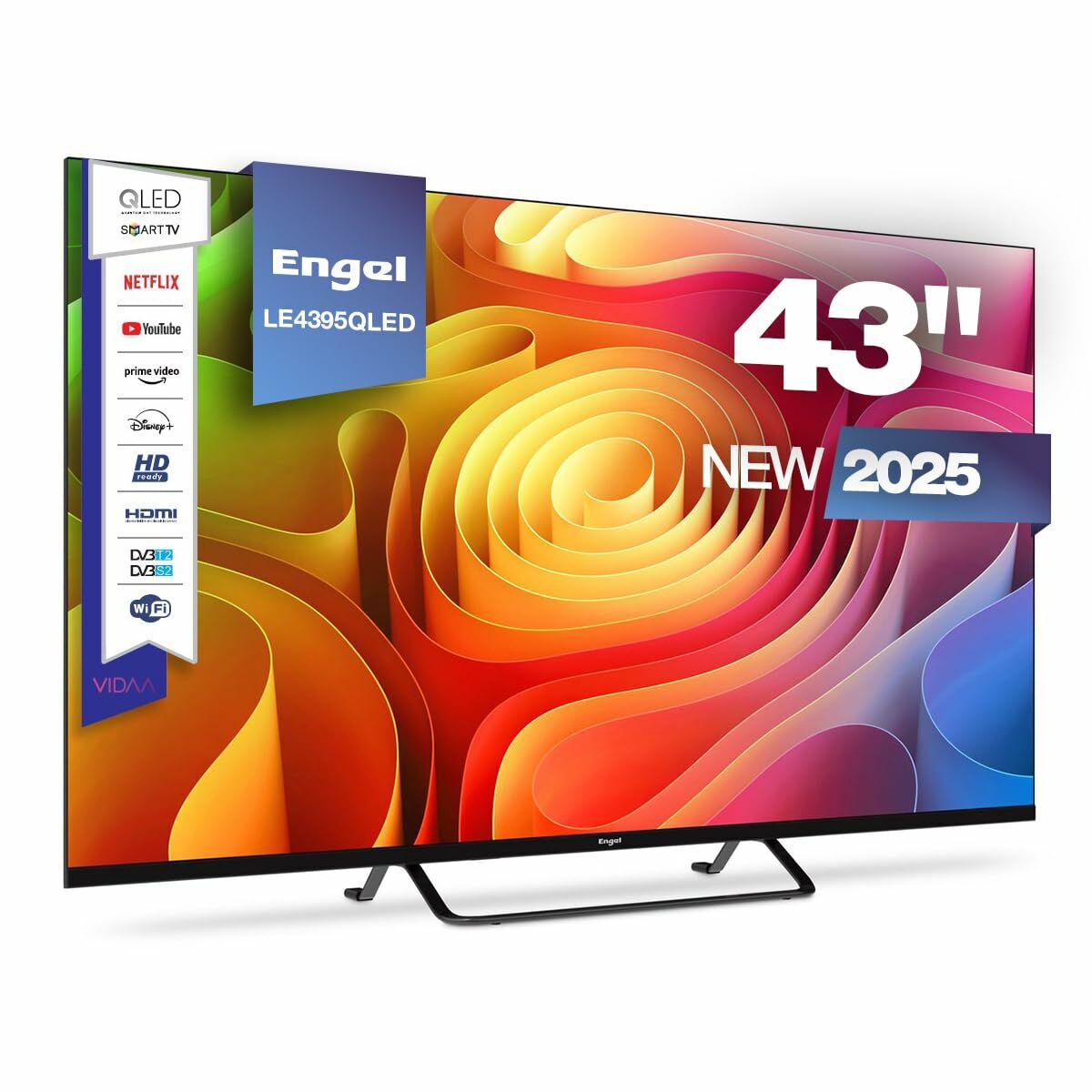 The Engel LE4395QLED is a Smart TV with a 43-inch screen designed to deliver an advanced visual experience thanks to its QLED display with 4K Ultra HD resolution (3840 x 2160 pixels), providing sharp images and vivid colors with high brightness and contrast typical of this technology. This TV features a flat screen design in black, making it easy to integrate into any modern, functional space. It runs on the VIDAA operating system, allowing easy access to streaming content and apps, enhancing user interaction with Smart TV features. It includes a digital tuner compatible with DVB-C, DVB-S2, and DVB-T2 formats, ensuring broad coverage and reception of cable, satellite, and terrestrial digital TV signals. Additionally, it offers connectivity through multiple ports, including HDMI and USB 2.0, for connecting external devices like consoles, media players, or external drives, increasing the device’s versatility. Its estimated RMS audio power of 16 W delivers sound suitable for a standard home environment, accompanied by extra functions such as teletext and an electronic program guide (EPG), which improve usability by facilitating access to information and content. Despite having an energy efficiency rating of F, this model is a solid option for those seeking a compact TV with QLED technology, 4K resolution, and smart features, suitable for home settings prioritizing image quality and connectivity in a 43-inch format. Overall, the Engel LE4395QLED positions itself as a balanced device combining basic and modern features for home audiovisual entertainment.
