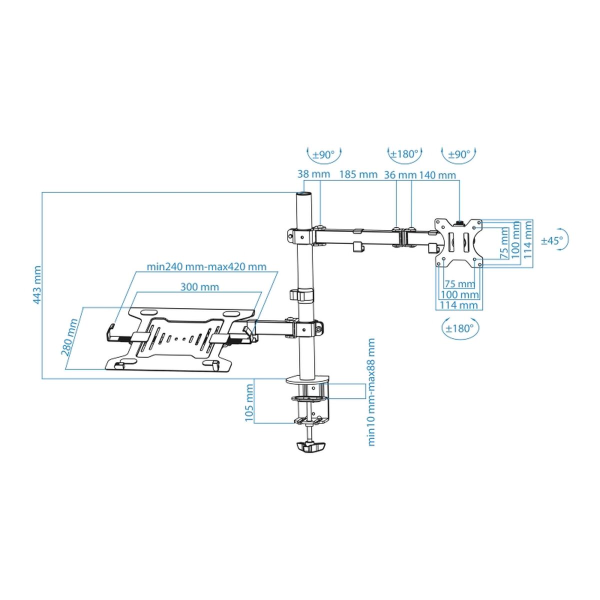 The TooQ DB1200TN-B laptop and monitor stand is a sturdy and versatile desktop mount designed to adapt and optimize workspaces by securely holding devices. Made of durable steel with a black finish, this stand supports monitors and laptops, fitting sizes from 13 to 32 inches for screens and 10 to 15.6 inches for laptops. It holds a maximum weight of 8 kg per monitor arm and up to 4.5 kg for laptops, ensuring stable and reliable fixation. It features full compatibility with VESA 75x75 and 100x100 standards, facilitating installation of most monitors on the market. Its functional design allows ergonomic adjustments with a wide range of motion: tilt of +45°/-45°, swivel of +90°/-90°, and full rotation of +180°/-180°, enabling optimal screen or laptop positioning according to user needs. The stand attaches to the desk via clamp or through bolt, suitable for surfaces between 10 and 88 mm thick with the clamp and 10 to 75 mm with the bolt, offering great adaptability to different furniture types. The frame height is 443 mm and the total weight is approximately 6.32 kg net, providing stability without being overly heavy. The product comes complete with a mounting kit including tools and installation manual, making assembly straightforward. This stand is designed to optimize workspace and improve ergonomics by allowing proper positioning of screens and laptops within a wide size range, making it suitable for professional and home environments. In short, the TooQ DB1200TN-B is a practical and durable solution for those needing adaptable, secure, and efficient support for their display and work devices.