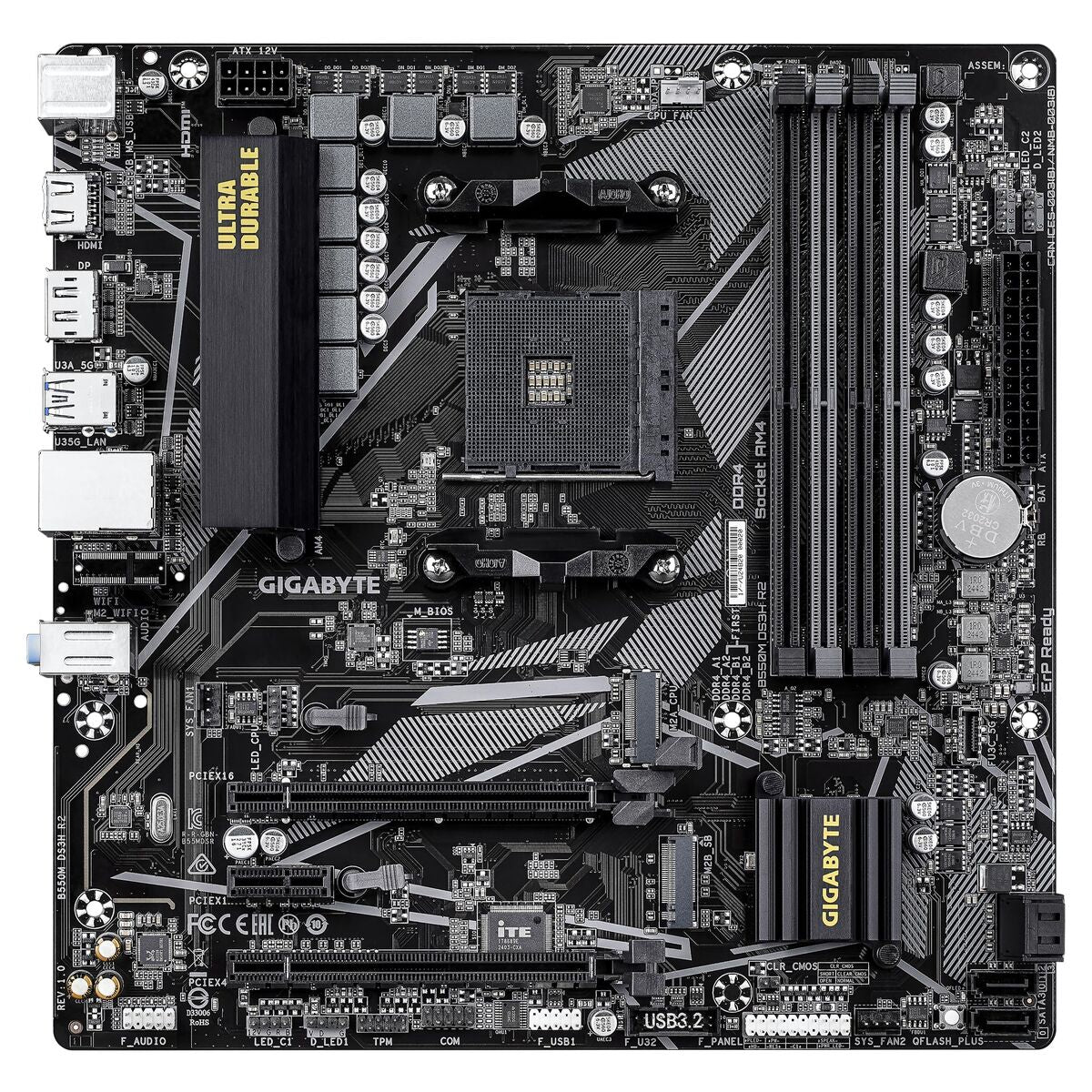 The Gigabyte 9MB55MDSR-00-G10 motherboard is a MicroATX model designed to deliver balanced and versatile performance in systems with AMD processors. Compatible with the AMD AM4 socket, this board features the AMD B550 chipset, which supports the latest AMD CPU generations and enables advanced technologies like PCIe 4.0, ideal for users seeking stability and higher bandwidth for storage devices and graphics cards. It stands out for supporting DDR4-SDRAM memory with a maximum capacity of up to 128 GB across four DIMM slots, ensuring ample room for multitasking and demanding applications. Regarding connectivity, it includes modern interfaces such as HDMI and DVI ports for easy multi-display setup, as well as Gigabit Ethernet for fast and stable networking. It offers flexible storage options with support for 4 SATA 3 ports and 2 M.2 slots, allowing a combination of NVMe SSDs and traditional SATA drives for optimized data management performance. It also features a total of 6 USB 3.2 ports, ensuring compatibility with high-speed external devices. Its electrical design and quality components provide stability and durability, essential for professionals, gamers, or content creators who require reliability and efficiency in their setups. In short, the Gigabyte B550M DS3H R2 motherboard is a solid, up-to-date solution for building high-performance AMD systems within a compact and functional form factor.