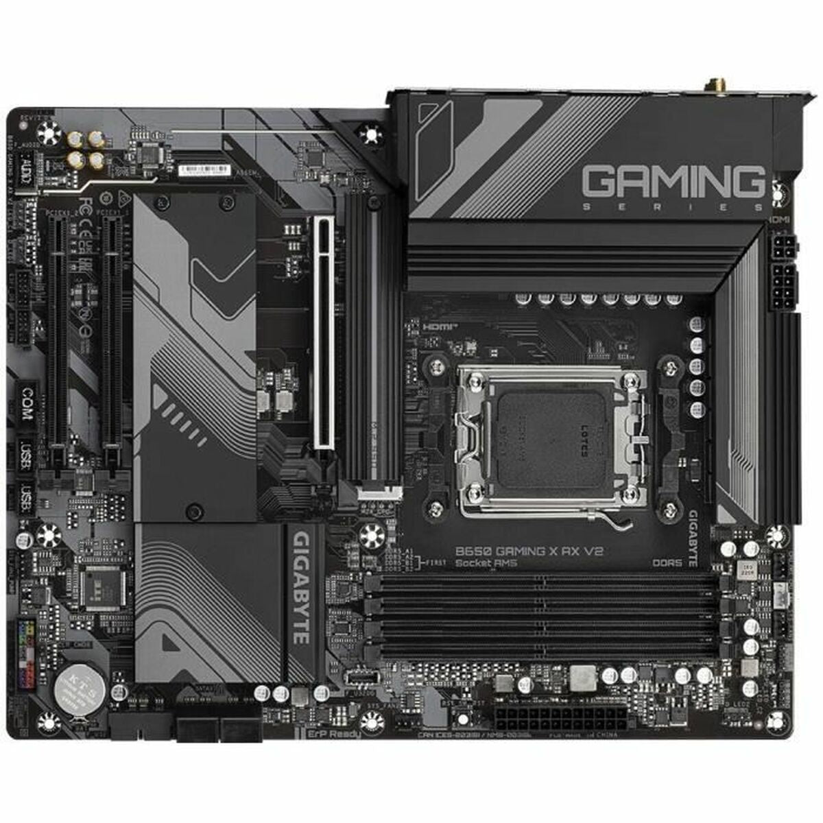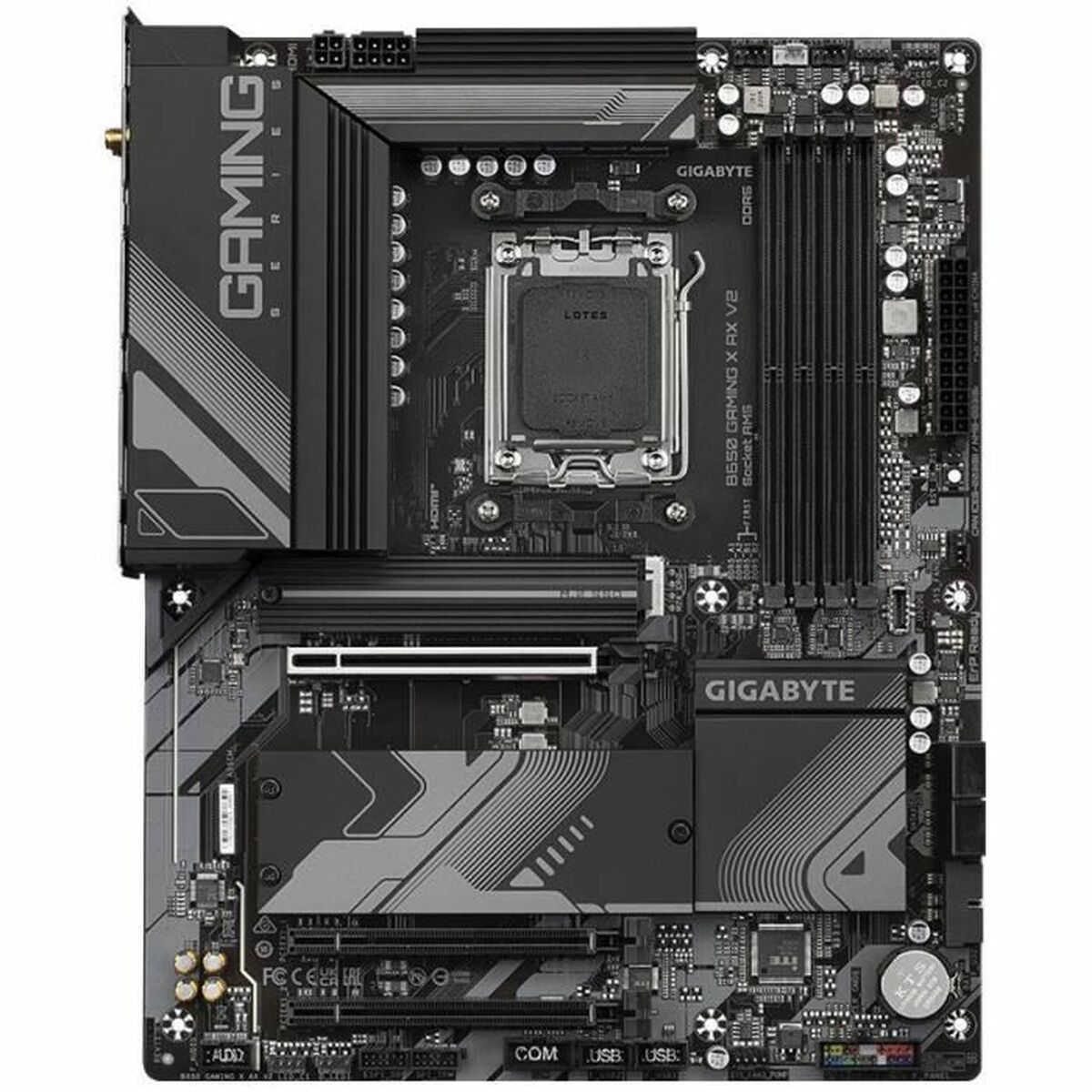 The Gigabyte B650 GAMING X AX V2 is a motherboard designed for advanced users and hardware enthusiasts seeking support for the latest generation of AMD processors. This board features the AMD B650 chipset and is compatible with the AMD AM5 socket, offering support for AMD Ryzen™ processors from 5th to 7th generation, ensuring excellent upgrade potential and performance for demanding applications and gaming. Its ATX form factor provides a balanced space and compatibility with a wide range of cases and cooling systems. It includes four slots for DDR5 RAM, supporting up to 192 GB of DIMM memory, allowing maximum capacity and system responsiveness. For storage, it supports multiple technologies including 6 SATA III ports for traditional hard drives and SSDs, plus two M.2 PCI Express 4.0 connectors for high-performance NVMe SSDs that speed up access and data transfer times. Connectivity options are enhanced with an advanced network system that includes 2.5 GbE Ethernet for fast wired connections, as well as Wi-Fi 6E and Bluetooth 5.3 for stable and fast wireless links. The board also features multiple USB 3.2 ports, both Type A and Type C, offering great versatility for modern external devices and peripherals. For video output, it includes HDMI and DisplayPort interfaces, supporting resolutions up to 4096 x 2160 pixels, suitable for 4K monitor setups. Its design combines black and brown colors within a sober aesthetic that fits gaming or professional environments. Additionally, it supports RAID 0, 1, and 10 configurations, enhancing the security and performance of connected storage drives. Overall, the Gigabyte B650 GAMING X AX V2 provides a solid and advanced foundation to build powerful and versatile systems aimed at intensive use requiring compatibility with the latest technologies and ample upgrade potential. This motherboard stands out by combining performance, connectivity, and support for the latest memory and storage technologies, making it a reliable and up-to-date choice for demanding users.