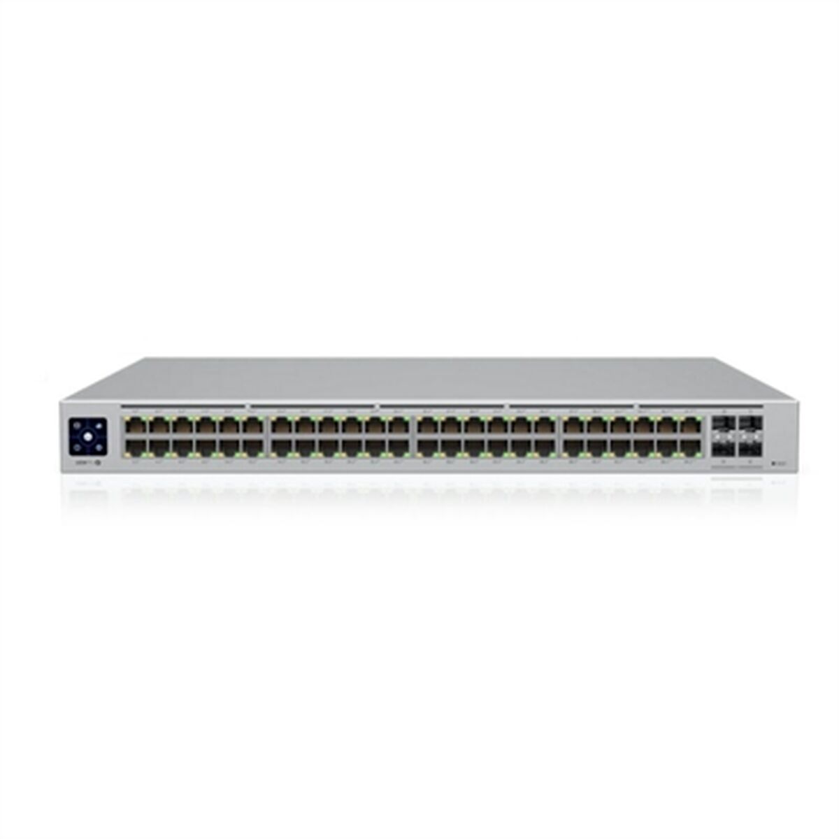 The Ubiquiti USW-PRO-48-POE switch is an advanced professional solution designed for robust, high-capacity network infrastructures. This device features a silver metal chassis housing 48 RJ45 Ethernet LAN ports with 10/100/1000 Mbps speed, providing reliable, high-speed connectivity for corporate or data center environments. The inclusion of PoE (Power over Ethernet) ports allows powering compatible devices, such as IP cameras or access points, through the same network cable, simplifying installation and reducing wiring. Its rack-mount design offers stability and easy integration into standard racks, while the LED indicators provide immediate visual monitoring of each port’s status and activity, aiding network management and maintenance. Additionally, the switch includes SFP ports that expand flexibility for fiber optic connections, enabling greater range and speed for data transmission. The combination of 48 Gigabit ports and PoE capabilities makes this model ideal for network architectures requiring high performance, reliability, and advanced management in professional settings. This equipment stands out for its ability to handle large traffic volumes efficiently and with integrity, meeting the demands of complex networks. In short, the Ubiquiti USW-PRO-48-POE is a professional switch offering an optimal balance of functionality, power, and versatility, designed for modern, demanding network infrastructures.