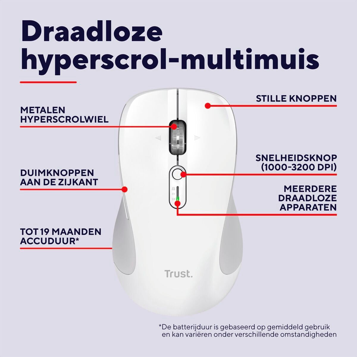 The Trust 25674 wireless mouse is designed to provide an optimal ergonomic experience and comfort during long usage sessions. Its Bluetooth connectivity allows easy, cable-free connection with computers and other compatible devices, enhancing mobility and eliminating cable restrictions. This model stands out for its ergonomic design, shaped to fit the hand and reduce muscle fatigue, benefiting both professional and leisure use. Made from durable materials like ABS and finished in an elegant, modern white color, it combines durability and style. It also offers adjustable sensitivity up to 3200 DPI, ensuring precise and fast response, suitable for everyday tasks and work requiring finer cursor control. Its compact, functional design, along with standard buttons, guarantees intuitive usability for users of all levels. Overall, this Trust Ferro mouse is a practical and efficient solution for those seeking a reliable wireless device with technical features that balance ergonomics, precision, and design.