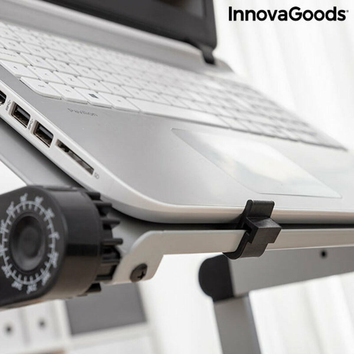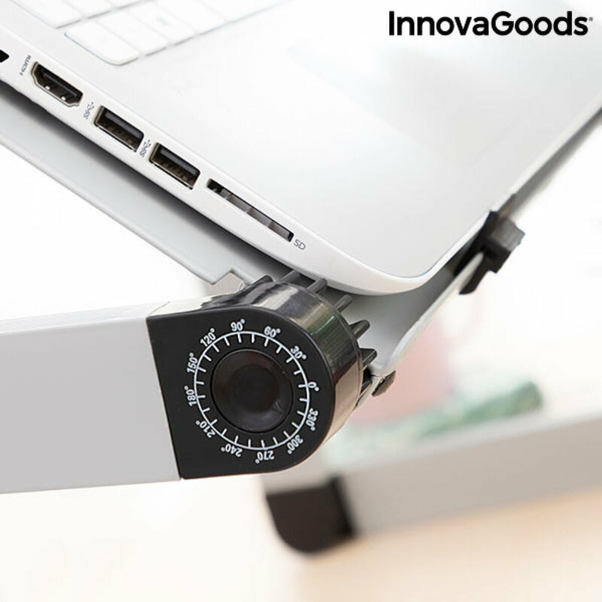 An adjustable multipurpose table, ideal for working on a laptop. It is also very useful for eating on, as a music stand, etc. Thanks to its great versatility and adaptable folding design, it can be used in different positions: on a chair or on the floor, lying down or seated, standing up on a stable surface, etc. It has a separate tray for a mouse and two legs jointed at 3 points with a rotaion of up to 360º, which allows adjustment of its height and lean so that if can offer an infinite number of possibilities to fully adapt it to your needs at any moment. The perforated aluminium support base enhances ventilation and reduces overheating. In addition, it includes a manual with recommended positions for different purposes.