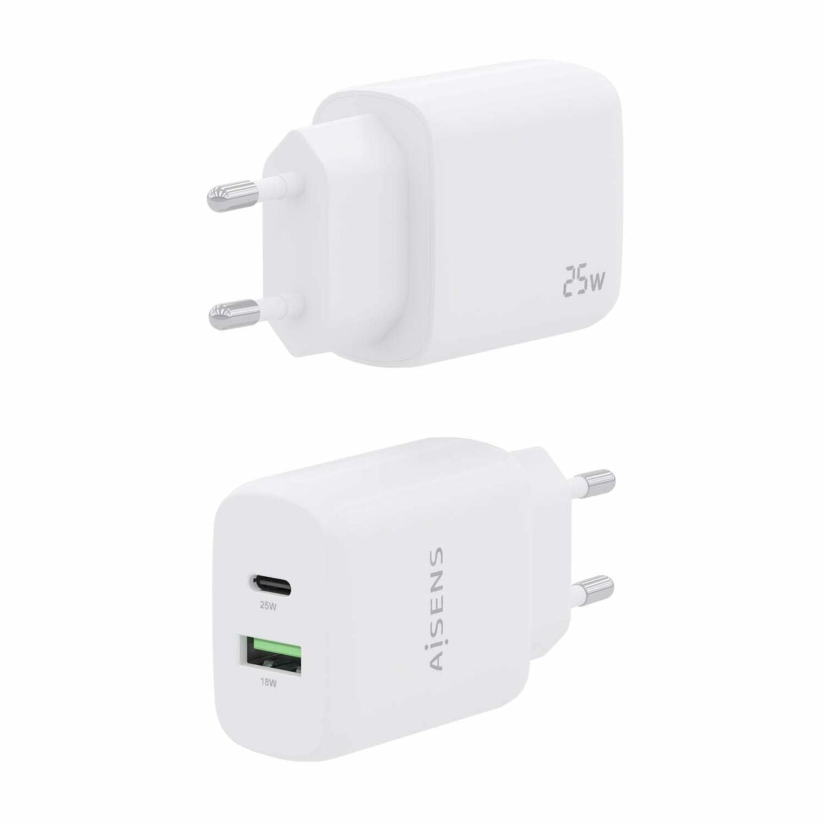 The Aisens A110-0758 wall charger is a device designed to provide a practical and efficient charging solution for multiple electronic devices, ideal for daily use in any setting. This charger features a compact and lightweight design in white, made of durable plastic, ensuring longevity and safe handling. It offers various connections for maximum compatibility, including a USB Type-C port and a USB 2.0 port, providing versatility to charge smartphones, tablets, headphones, or other devices compatible with these interfaces simultaneously. Its output power is 25W, allowing fast and efficient charging, helping reduce waiting time and ensuring a stable power supply. Thanks to its technology, it is suitable for a wide range of devices, making this charger a universal and functional option for users seeking a reliable and simple accessory for their daily charging needs. Its construction also guarantees safe use and good heat dissipation. The Aisens A110-0758 wall charger combines functionality, practical design, and quality, offering an effective solution to keep your devices always ready to use.